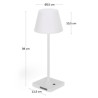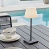 Candeeiro de mesa portátil ao ar livre. Permite várias intensidades de luz LED, a bateria recarregável incluída e entrada USB para carregar os seus dispositivos eletrónicos