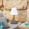 Candeeiro de mesa portátil. Possibilidade de diferentes intensidades de luz manualmente ou através do comando incluído. Apto para interiores e exteriores.