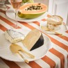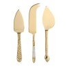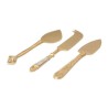 Conjunto de três facas de queijo na cor dourada. Cada faca tem uma forma diferente e um design diferente no cabo.