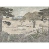 Retratando a paisagem natural da savana do Serengeti da Tanzânia, o papel de parede é habilmente colorido em uma paleta suave e antiga de azul, verde, bege e marrom para criar um toque vintage nos quartos.